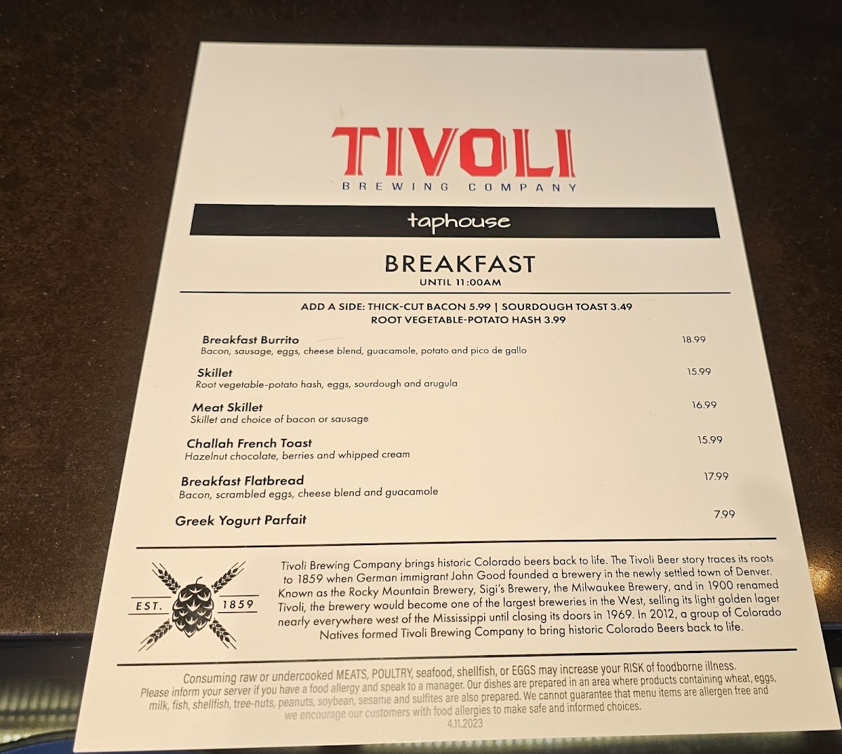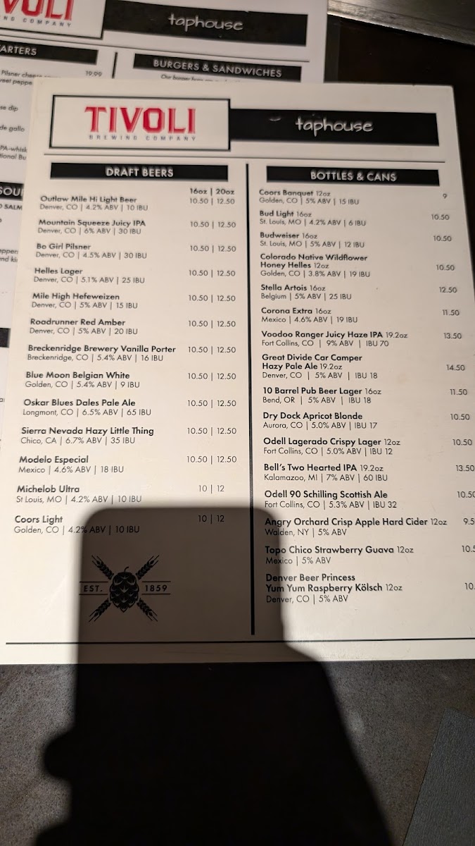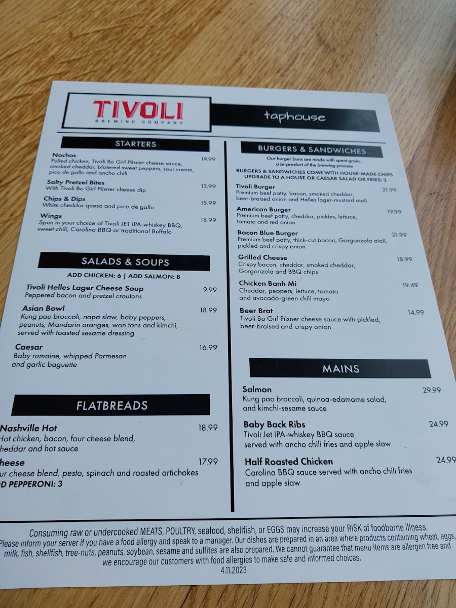 Tivoli Tap House Menu